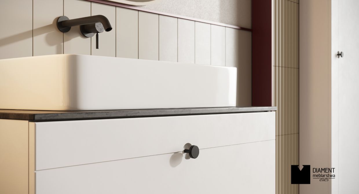 Fronty modułów meblowych wykonano z trwałej płyty MDF i polakierowano również od wewnątrz, co zwiększa odporność na wilgoć. Zastosowano tu również nowoczesne systemy: pełne szuflady pod syfon oszczędzający przestrzeń, system soft close, prowadnice z pełnym wysuwem. Wszystkie szuflady mają smukłe, metalowe boki, wewnątrz których znajdują się prowadnice z pełnym wysuwem i możliwością udźwigu nawet do 25 kg.