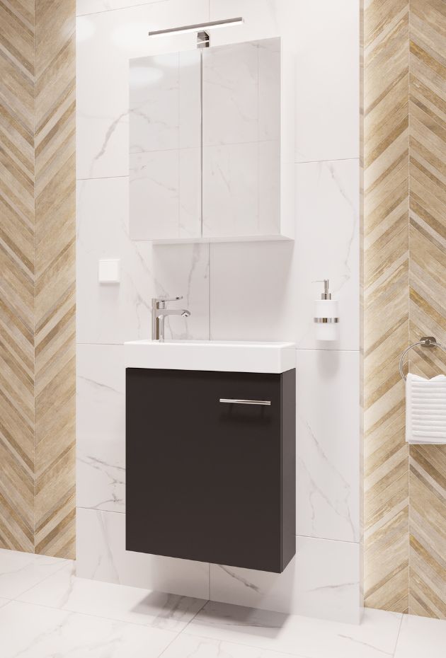 W bardzo ciasnych łazienkach liczy się każdy centymetr, dlatego szafki Kim i Campo są bardzo płytkie – w zależności od modelu mają 21, 22 lub 23 cm.