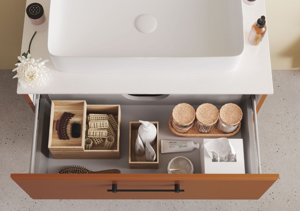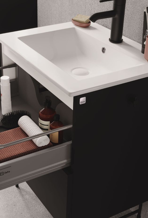 Górna szuflada w szafce pod umywalkę została dostosowana pod płaski syfon. To znaczy, że nie ma w niej niewykorzystanej przestrzeni, a Ty masz więcej miejsca na swoje rzeczy.