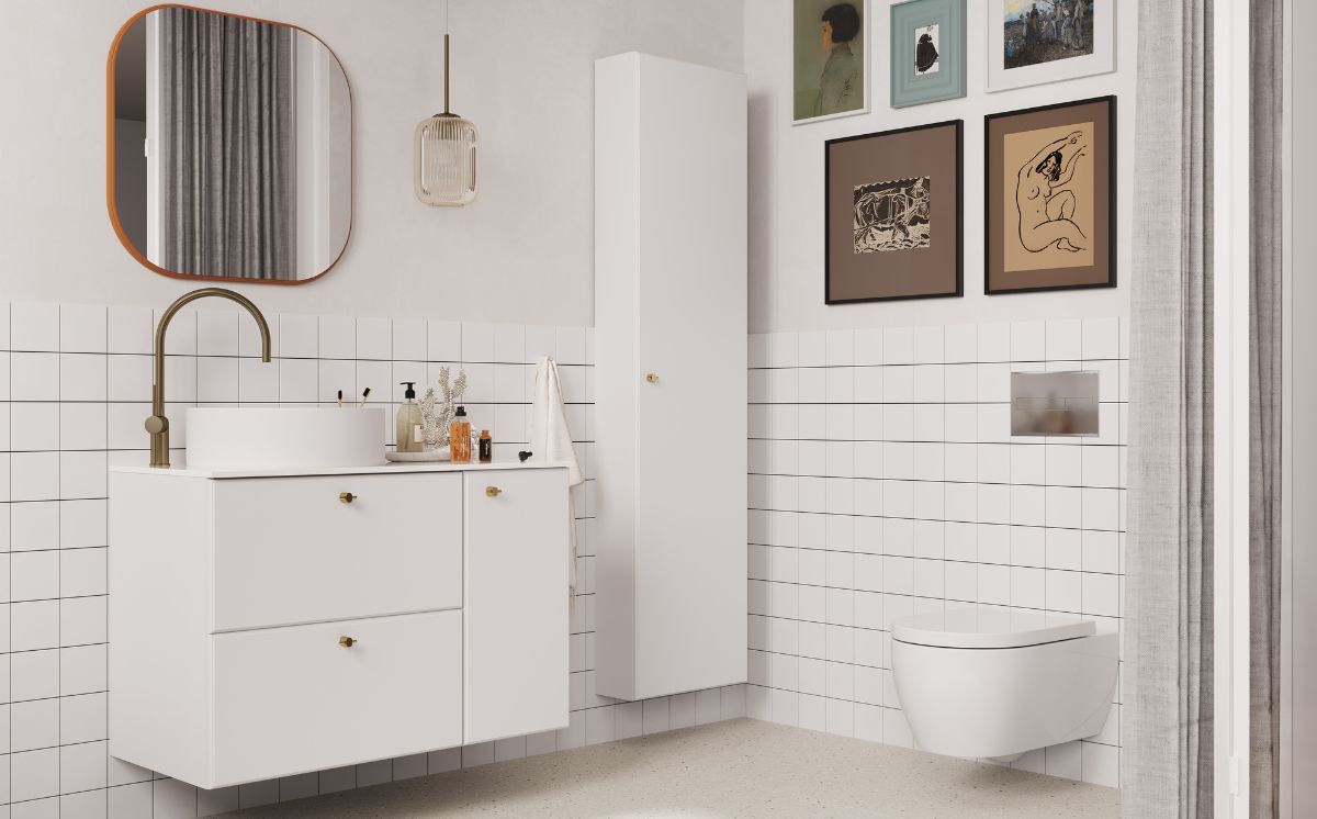 Białe meble to doskonała propozycja do każdej łazienki. W połączeniu ze złotymi dodatkami – uchwytami Twig, baterią i lampą prezentują się bardzo stylowo.