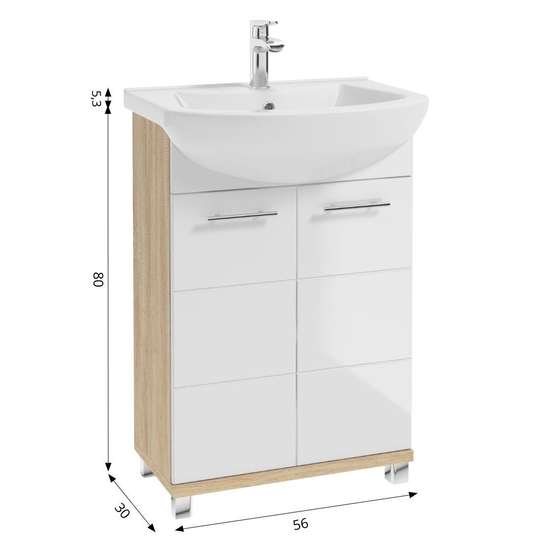 Szafka pod umywalkę BARI D60 to idealne rozwiązanie do małych i średnich łazienek, w których liczy się przestrzeń. Fronty mebla są białe, natomiast boki zaplanowano w dekorze dębu sonoma, co stanowi modne i sprawdzone połączenie, które sprawdzi się w każdej łazienkowej aranżacji.