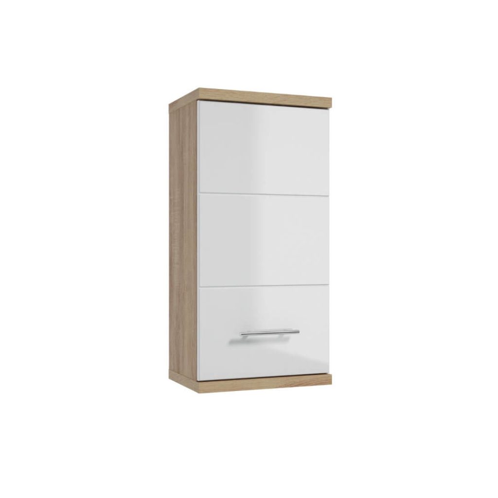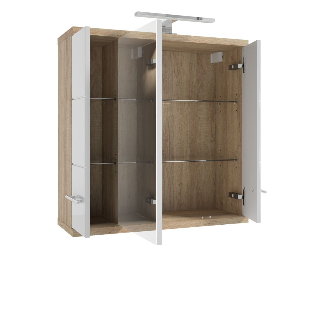 Wisząca szafka lustrzana BARI E70 o szerokości 70,1 cm. Szafka posiada troje drzwi i wewnętrzne półki z możliwością regulowania wysokości. Fronty szafki wykończono odpornym na promieniowanie UV lakierem w białym połysku. Dwoje drzwi szafki wykonane są z solidnej płyty MDF, które ozdobiono dekoracyjnymi frezami, nadając szafce geometrycznego charakteru. Drzwi środkowe to praktyczne lustro. Korpusy natomiast wykonano z płyty w dekorze dąb sonoma. Szafka posiada praktyczne relingowe uchwyty.