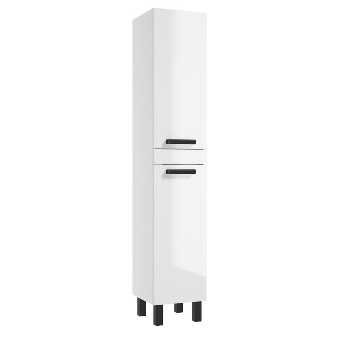 Mocnym akcentem tego modelu jest kontrastowe połączenie bieli mebla i czarnych detali. Wysokie, czarne nóżki sprawiają, że szafka prezentuje się lekko i modnie, a duże, geometryczne uchwyty, również o barwie czarni, podkreślają jej elegancki wygląd. Taki design sprawia, że słupek CAPRI świetnie pasuje do łazienek urządzonych w stylu skandynawskim, industrialnym czy minimalistycznym.