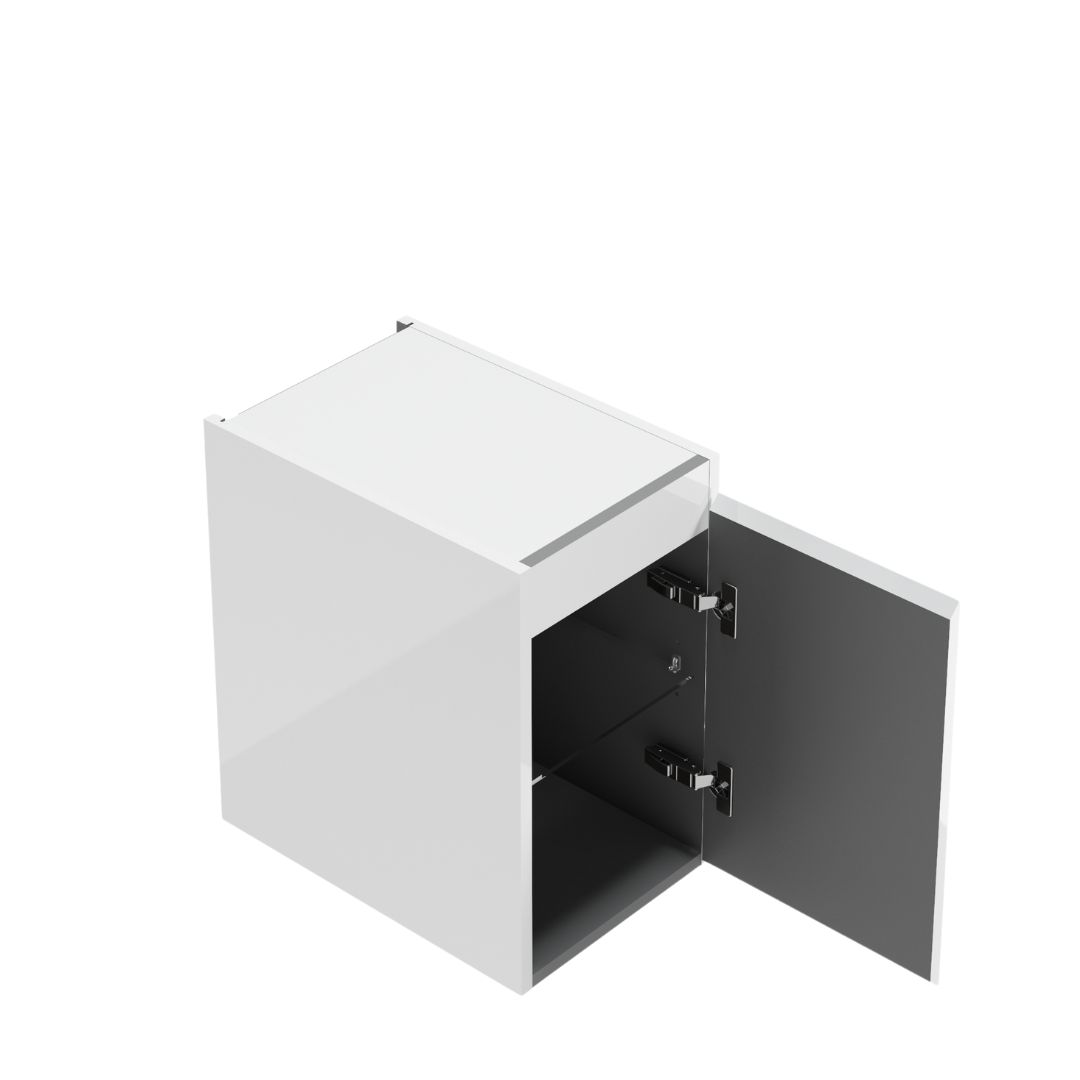 Wewnątrz szafki znajduje się szklana półka, która dzieli przestrzeń na pół, wyodrębniając dwie strefy przechowywania. Drzwi szafki możesz zamontować na dowolnej stronie, dzięki czemu dostosujesz zabudowę do własnych potrzeb.