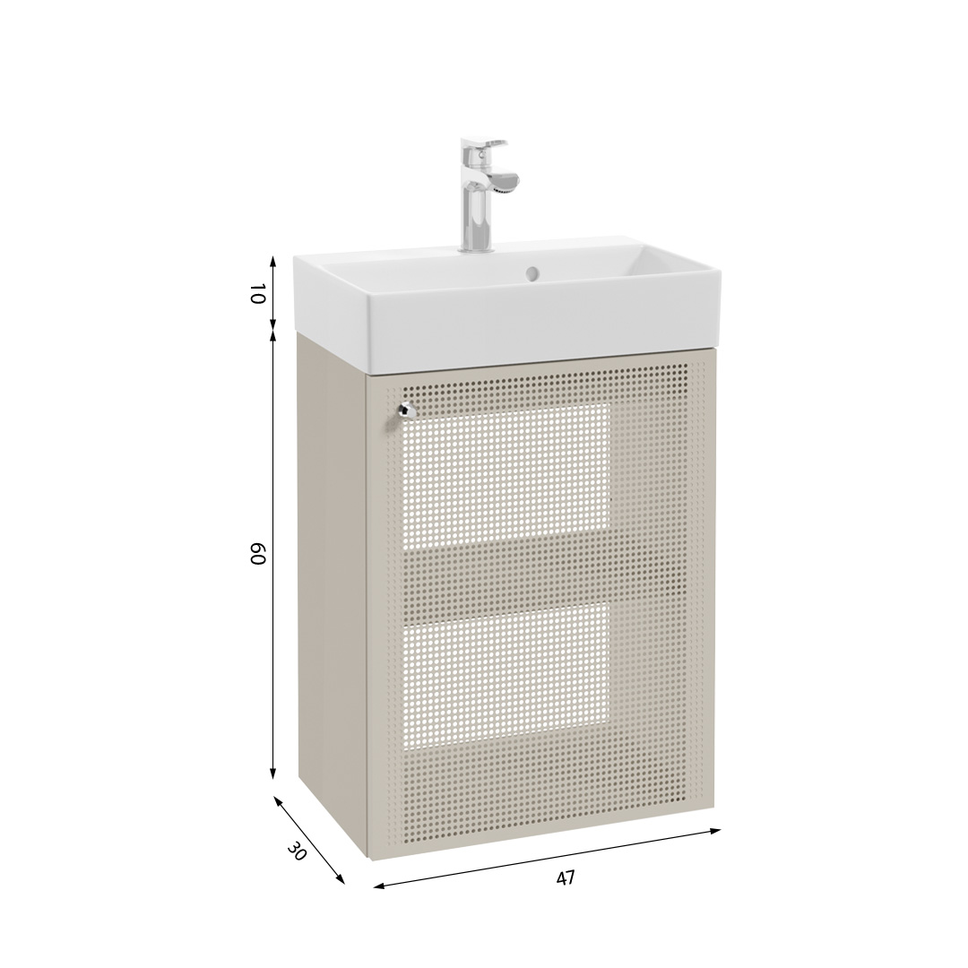 Front szafki został wykonany z perforowanego metalu, który nie tylko wygląda modnie i dizajnersko, ale jest też bardzo praktyczny – zapewnia doskonałą wentylację i jest odporny na wilgotne środowisko łazienkowe. Szafkę można uzupełnić o uchwyty dostępne w różnych wariantach i kolorach, dopasowując jej wygląd do charakteru wnętrza.