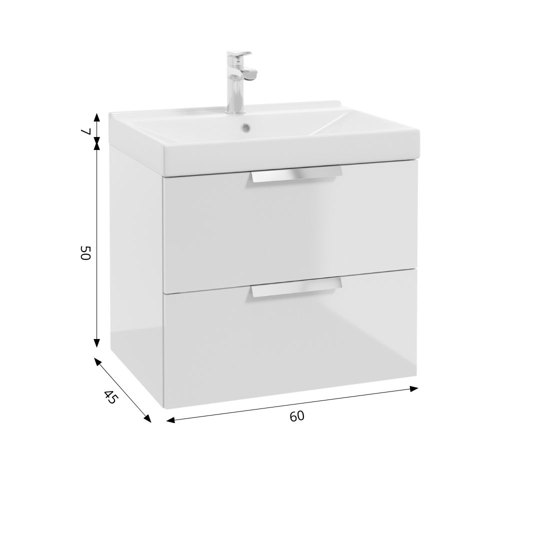 Szafkę podumywalkową z szufladami Faro możesz połączyć z umywalką meblową lub uzupełnić blatem (laminowanym lub konglomeratowym), na którym ustawisz dowolnie wybraną, pasującą rozmiarami, umywalkę nablatową. Pasujące umywalki meblowe to Nanu 60, Plan 60, Puro 60, Verso 60, Zeen 60. Blaty i umywalki nie są częścią zestawu, należy je kupić osobno.
