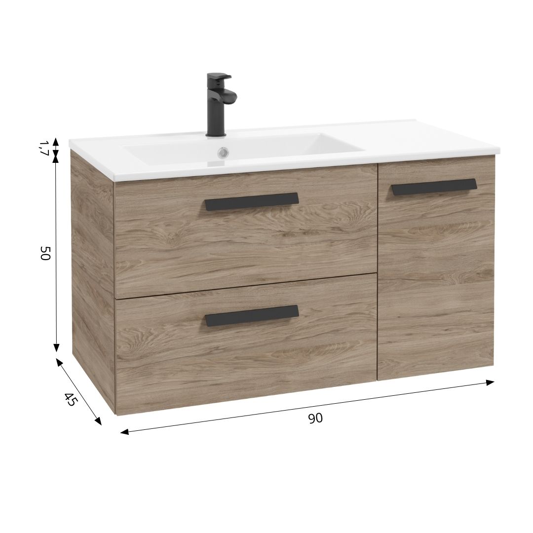 Szafkę podumywalkową z szufladami Faro D90 możesz połączyć z umywalką meblową lub uzupełnić blatem (laminowanym, postformingowym lub konglomeratowym), na którym ustawisz dowolnie wybraną, pasującą rozmiarami, umywalkę nablatową. Pasująca umywalka meblowa to Plan 90. Blaty i umywalki nie są częścią zestawu, należy je kupić osobno.