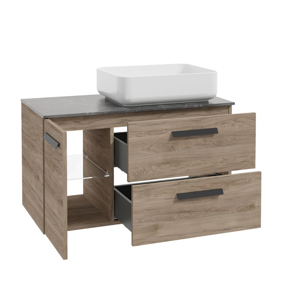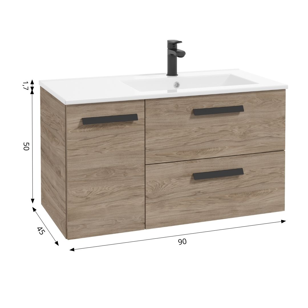 Szafkę podumywalkową z szufladami Faro D90 możesz połączyć z umywalką meblową lub uzupełnić blatem (laminowanym, postformingowym lub konglomeratowym), na którym ustawisz dowolnie wybraną, pasującą rozmiarami, umywalkę nablatową. Pasująca umywalka meblowa to Plan 90. Blaty i umywalki nie są częścią zestawu, należy je kupić osobno.