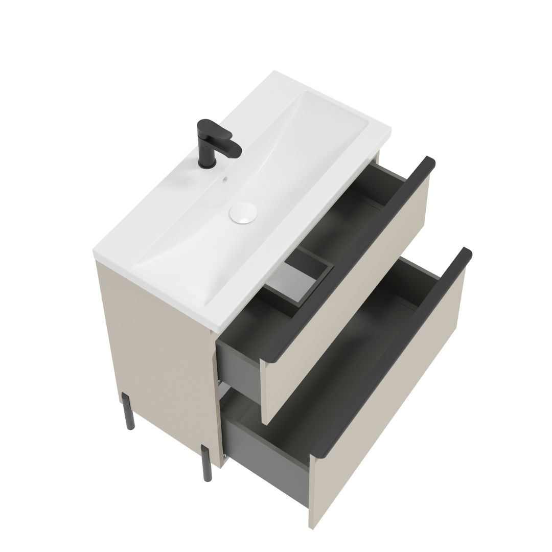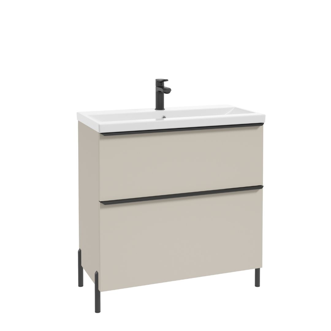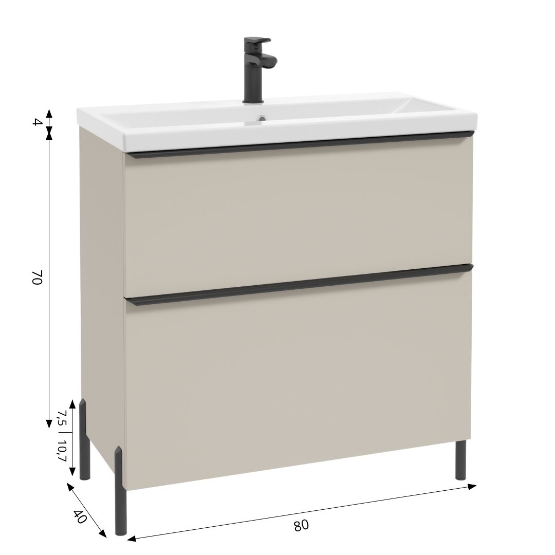 Szafka pod umywalkę w kolorze kaszmiru to ukłon w stronę ponadczasowej elegancji. Stonowany odcień świetnie komponuje się z jasnymi płytkami, naturalnym drewnem czy czarnymi akcentami. Matowa powierzchnia jest przyjemna w dotyku, nie eksponuje odcisków palców i jest łatwa do utrzymania w czystości, co jest szczególnie istotne w przestrzeni łazienkowej. Możliwość wyboru jednego z różnych wariantów uchwytów pozwala dostosować mebel do różnych stylów – od minimalistycznych po bardziej dekoracyjne. Mebel możesz uzupełnić o smukłe nóżki, dzięki którym cała aranżacja nabierze lekkości.
