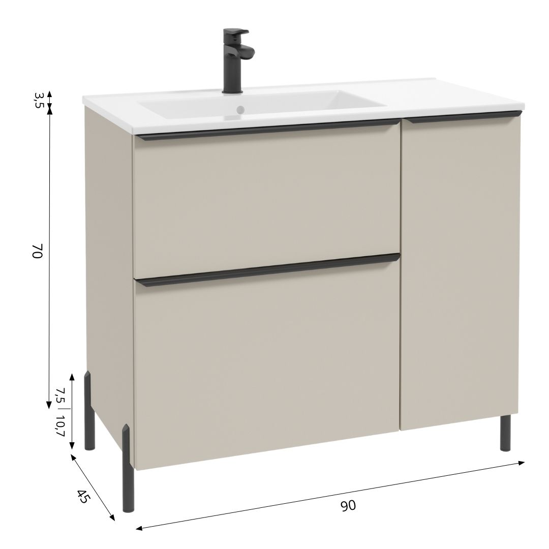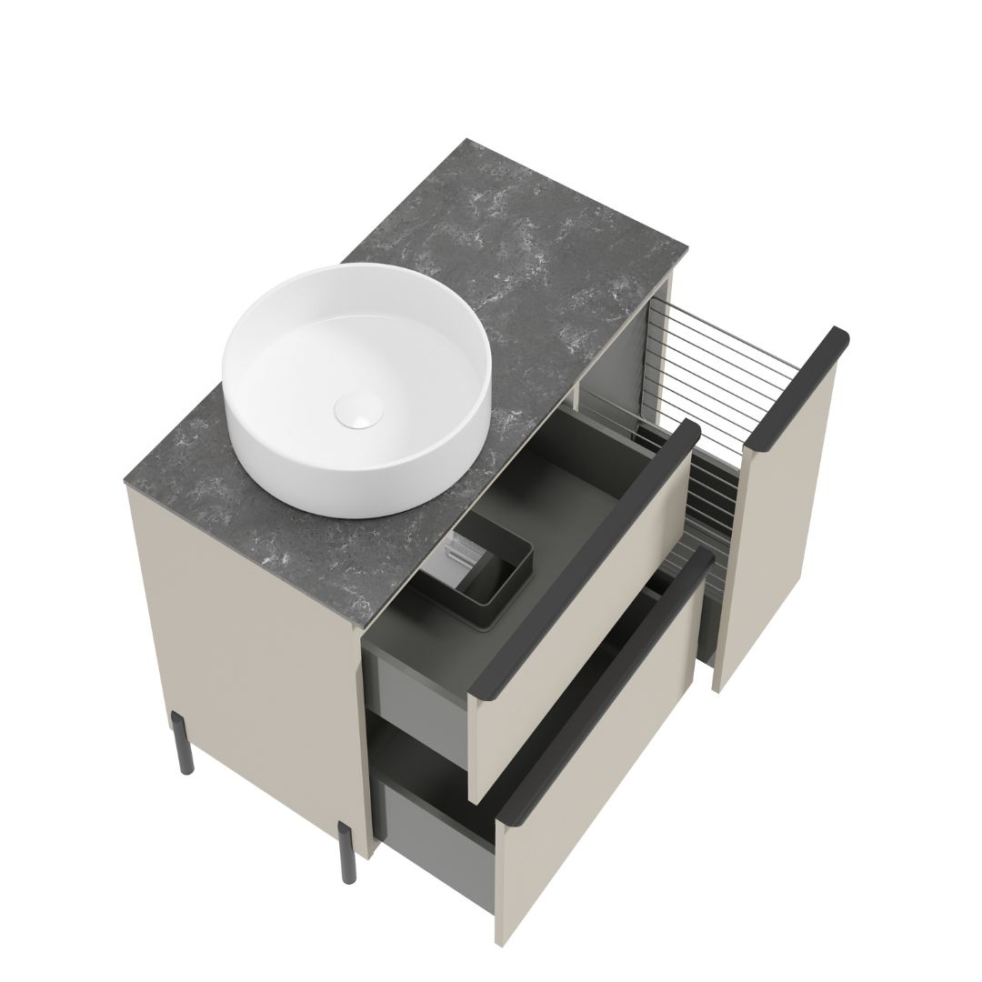 Szafkę pod umywalkę z szufladami Nino D90 możesz połączyć z umywalką meblową Plan D90 lub uzupełnić blatem (laminowanym, konglomeratowym lub posformingowym), na którym ustawisz dowolnie wybraną, pasującą rozmiarami, umywalkę nablatową.