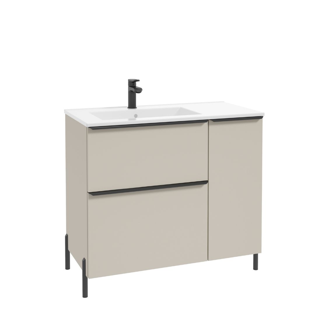 Duża szafka pod umywalkę w kolorze kaszmiru to ukłon w stronę ponadczasowej elegancji. Stonowany odcień świetnie komponuje się z jasnymi płytkami, naturalnym drewnem czy czarnymi akcentami. Matowa powierzchnia jest przyjemna w dotyku, nie eksponuje odcisków palców i jest łatwa do utrzymania w czystości, co jest szczególnie istotne w przestrzeni łazienkowej. Możliwość wyboru jednego z różnych wariantów uchwytów pozwala dostosować mebel do różnych stylów – od minimalistycznych po bardziej dekoracyjne. Mebel możesz uzupełnić o smukłe nóżki, dzięki którym cała aranżacja nabierze lekkości.