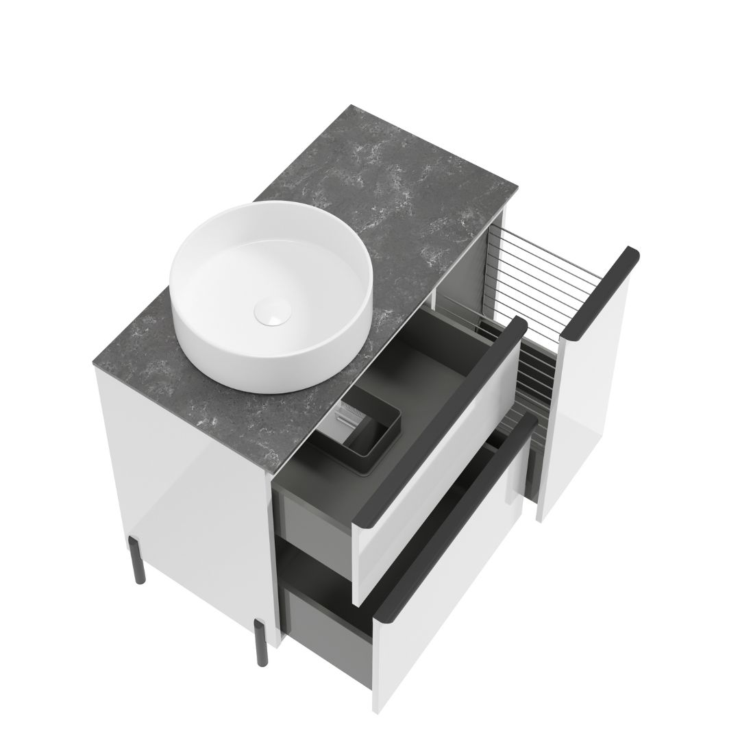 Szafkę pod umywalkę z szufladami Nino D90 możesz połączyć z umywalką meblową Plan 90 lub uzupełnić blatem (laminowanym, konglomeratowym lub posformingowym), na którym ustawisz dowolnie wybraną, pasującą rozmiarami, umywalkę nablatową.