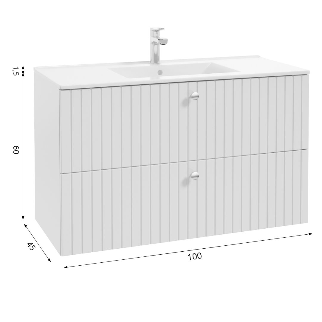Szafka podumywalkowa z dwiema szufladami Rietti D100 to idealne połączenie stylu i funkcjonalności. Jej fronty zdobią subtelne pionowe frezy, które nadają meblowi nowoczesny i wyjątkowy charakter. Uniwersalny dizajn sprawia, że szafka doskonale pasuje zarówno do nowoczesnych, jak i klasycznych aranżacji łazienkowych.