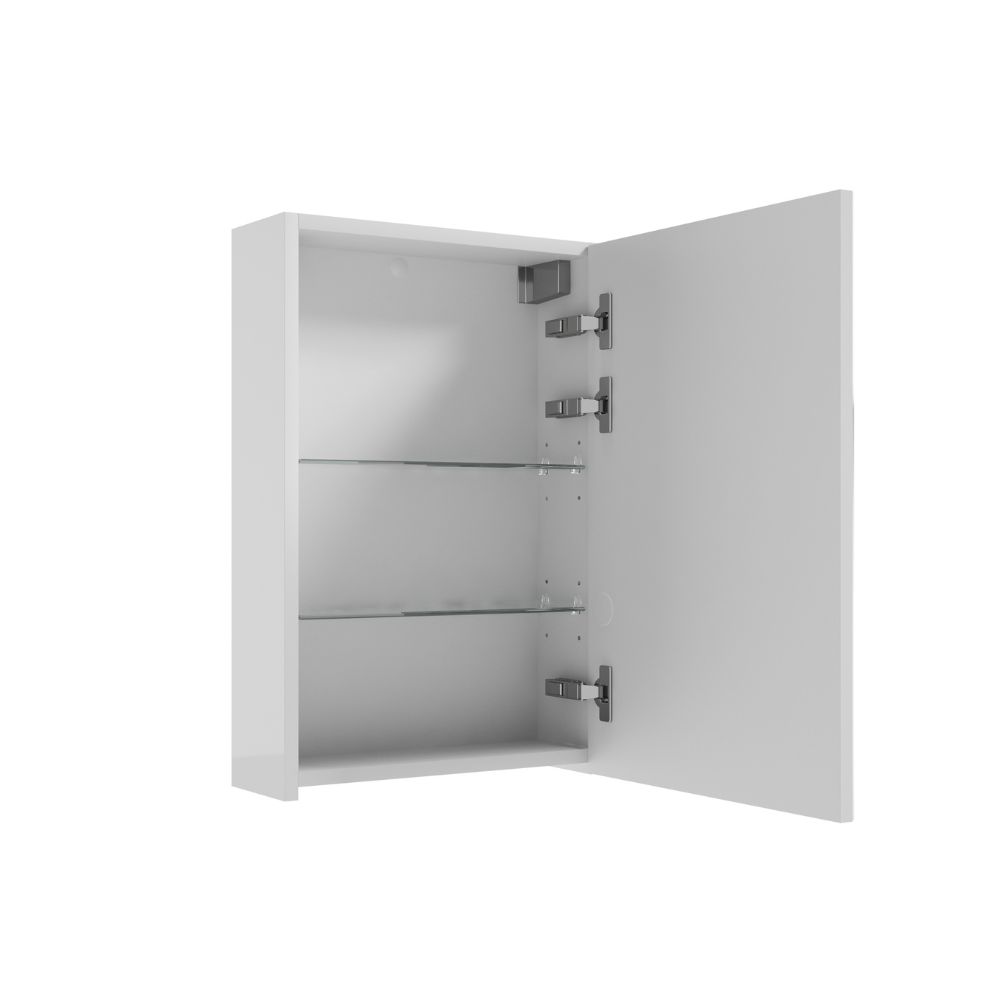 Wnętrze szafki wyposażono w regulowane szklane półki, które umożliwiają wygodne dostosowanie wysokości do przechowywanych kosmetyków i akcesoriów łazienkowych. Biała kolorystyka mebla nadaje mu elegancki, uniwersalny wygląd, łatwy w aranżacji z różnymi stylami wykończenia łazienki.