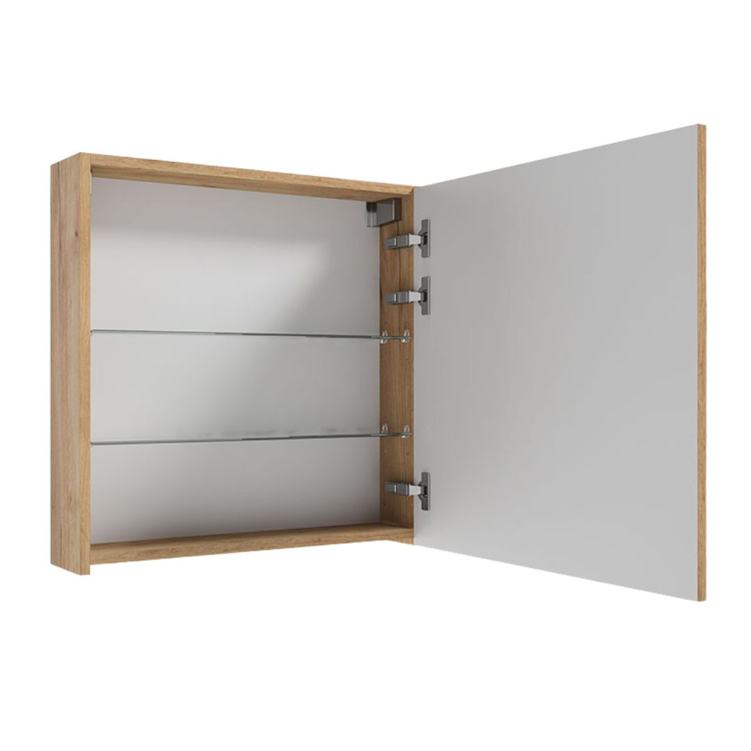 Wnętrze szafki wyposażono w regulowane szklane półki, które umożliwiają wygodne dostosowanie wysokości do przechowywanych kosmetyków i akcesoriów łazienkowych. Boki szafki zdobi dekor w odcieniu dębu evoke, który wprowadza do łazienki przytulny charakter.