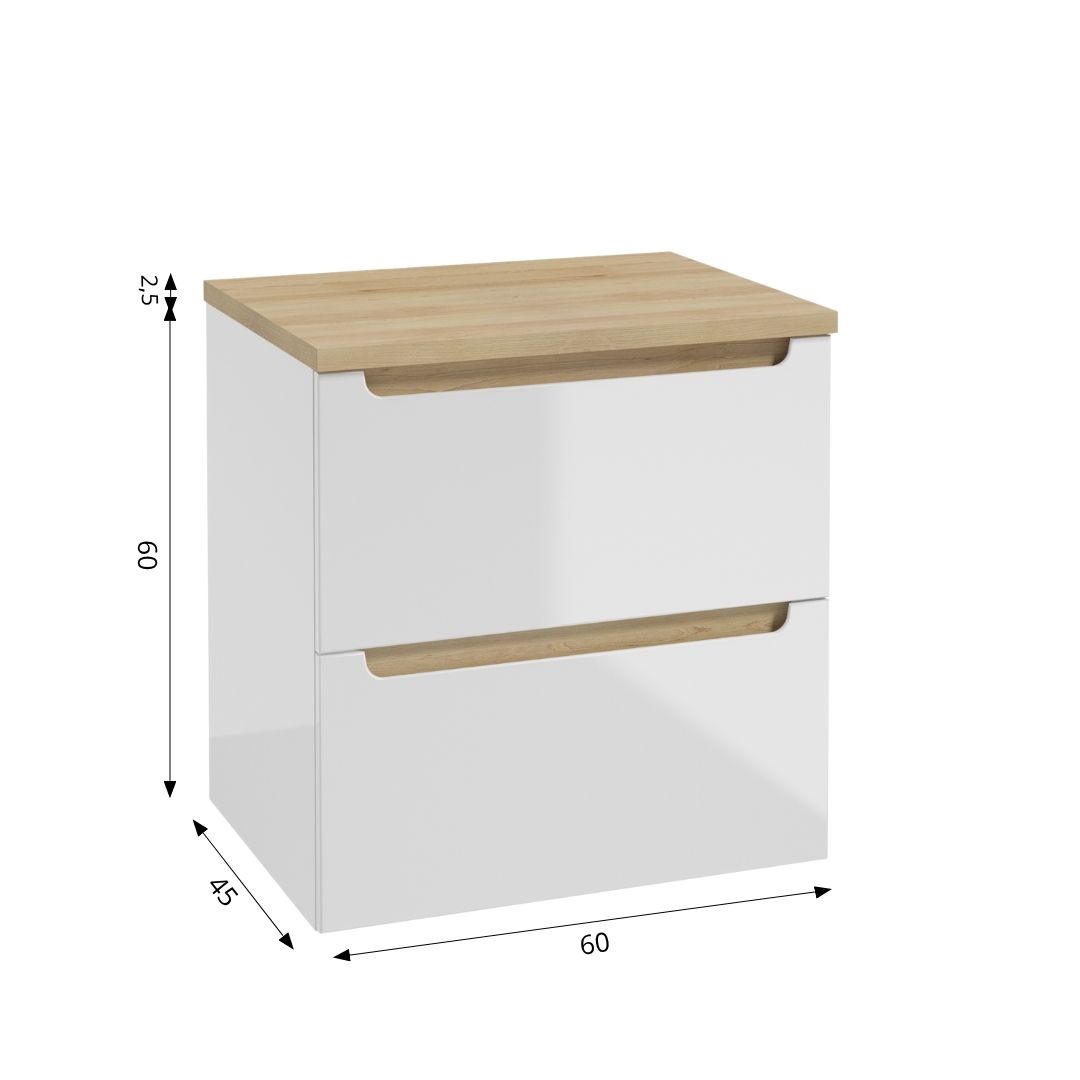 Ta elegancka, biała szafka wisząca z dwiema szufladami to doskonałe rozwiązanie do nowoczesnej łazienki. Mebel wyróżnia się prostym i stonowanym designem. Jedynym elementem dekoracyjnym jest ciekawe frezowanie, które pełni również rolę uchwytu. Za frezem znajduje się blenda, którą można wybrać spośród trzech kolorów: dekor buk truflowy, dekor czarny beton, lakier biały połysk. Wszystkie trzy kolory blend są w komplecie z szafką.