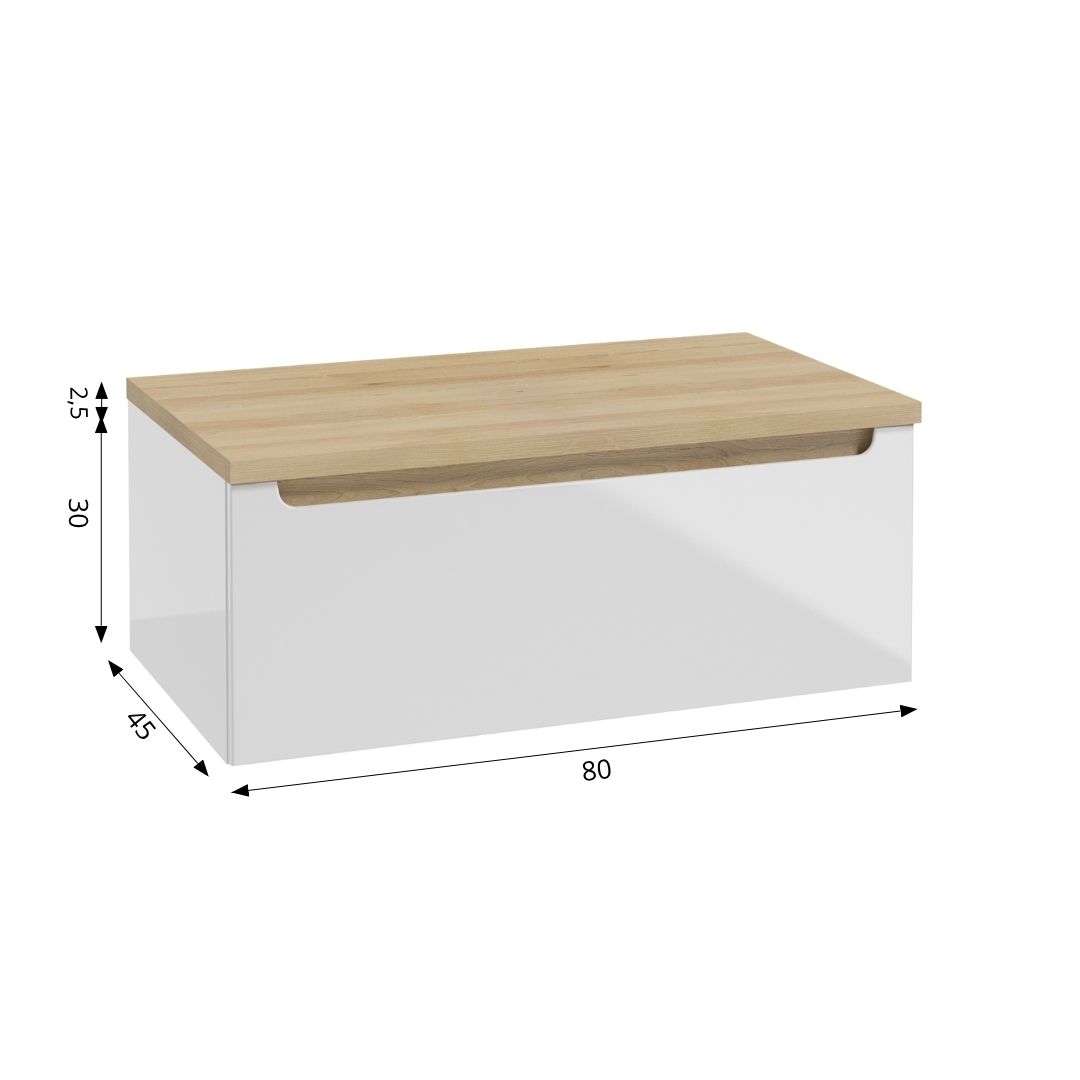 Ta elegancka, biała szafka wisząca z szufladą to doskonałe rozwiązanie do nowoczesnej łazienki. Mebel wyróżnia się prostym i stonowanym designem. Jedynym elementem dekoracyjnym jest ciekawe frezowanie, które pełni również rolę uchwytu. Za frezem znajduje się blenda, którą można wybrać spośród trzech kolorów: dekor buk truflowy, dekor czarny beton, lakier biały połysk. Wszystkie trzy kolory blend są w komplecie z szafką.