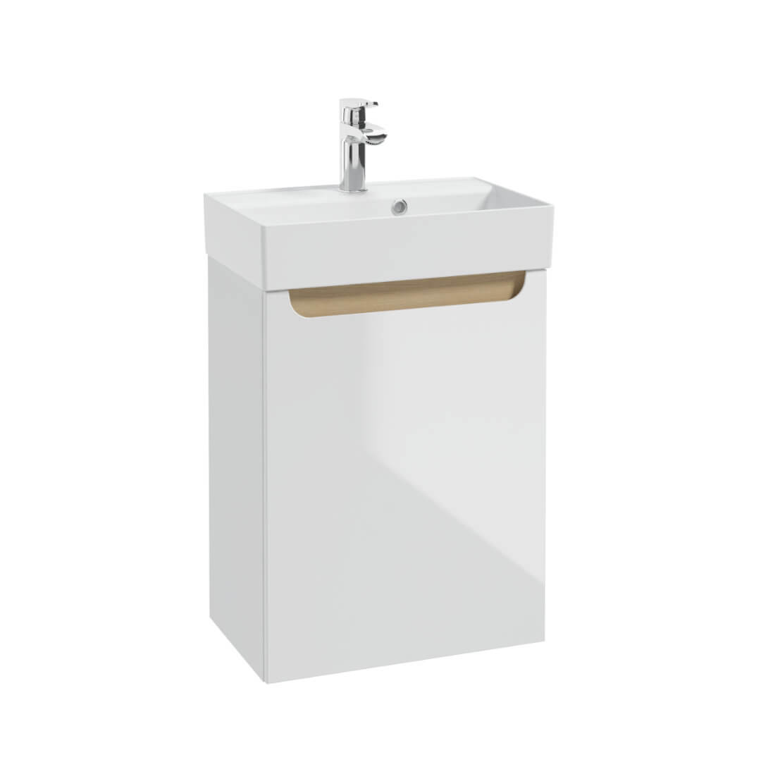Kompaktowa szafka wisząca pod umywalkę zaprojektowana z myślą o toaletach i małych łazienkach. Niewielka szerokość (50 cm) i optymalna głębokość (30 cm) sprawiają, że mebel zmieści w naprawdę niedużych przestrzeniach. Mimo niewielkich rozmiarów, szafka oferuje wystarczająco dużo miejsca do przechowywania podstawowych akcesoriów łazienkowych. Wewnątrz szafki znajduje się półka, która pomaga w organizacji i utrzymaniu porządku.