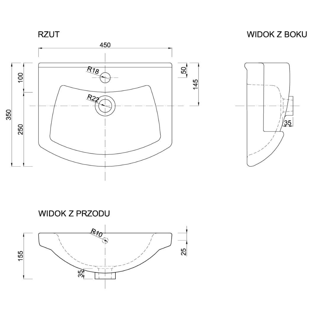 Umywalka ceramiczna TOMASO 45 o klasycznej linii, z wygodną, głęboką misą.