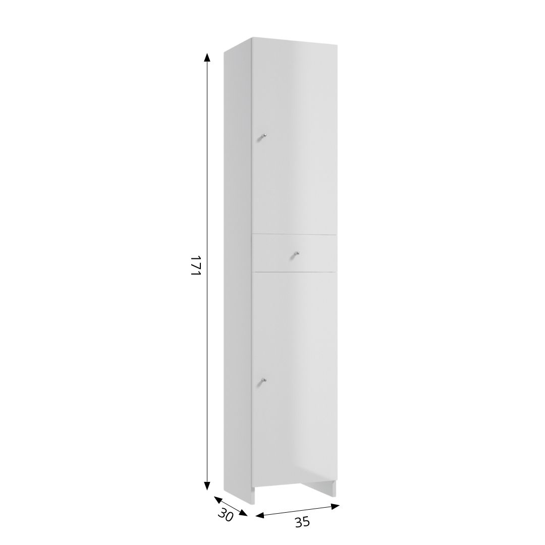 Wysoki słupek VENUS C170 bez cokołu. Szafka posiada dwoje drzwi oraz szufladę na podręczne akcesoria. Za drzwiami znajdują się wewnętrzne półka z możliwością zmiany wysokości. Fronty wykończone są białym, błyszczącym lakierem, natomiast korpusy wykonano z białej płyty laminowanej. Szafka posiada delikatne, jednopunktowe uchwyty. Montaż drzwi możliwy jest w taki sposób, aby otwierały się na prawa lub lewą stronę, w zależności od potrzeby.