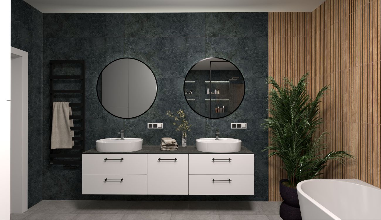 Sercem projektu jest zestaw modułowych szafek Mo-re (szafka pod umywalkę D80, szafka pod blat z koszem D50, szafka pod umywalkę D80), połączonych pod wspólnym blatem. Dzięki tej konstrukcji przestrzeń zyskuje spójną linię i wyjątkową lekkość, a jednocześnie oferuje funkcjonalne przechowywanie. Dwie umywalki nablatowe tworzą komfortową strefę użytkową dla dwóch osób, podkreślając praktyczny wymiar aranżacji.