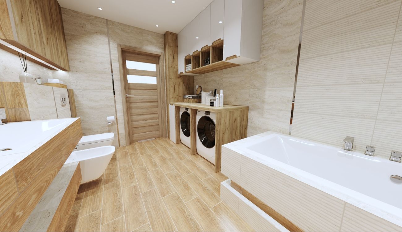 Na pierwszy plan wysuwa się zabudowa strefy pralni – z blatem w dekorze drewna, pod którym znalazły miejsce pralka i suszarka oraz z praktyczną szafką. Nad nimi zaplanowano pojemne szafki w białym połysku. Otwarta część z kubikami świetnie sprawdza się jako przestrzeń na ręczniki czy drobne akcesoria. To rozwiązanie, które ułatwia utrzymanie porządku i świetnie wpływa na funkcjonalność łazienki.